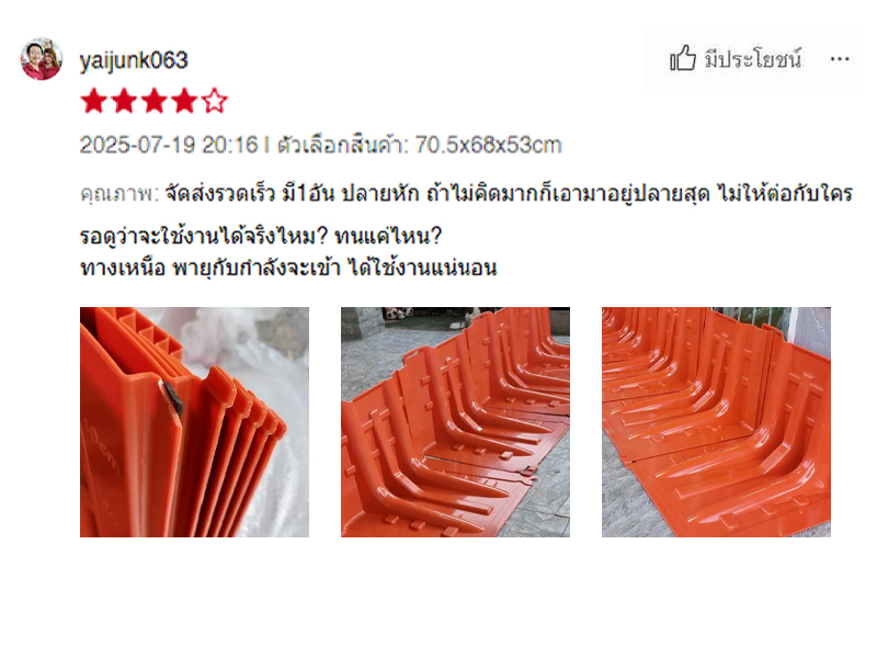 | กำแพงกั้นน้ำท่วม ขนาด 70 ซม. | มุมโค้งกั้นน้ำท่วม ขนาด 50 ซม. | กำแพงกั้นน้ำท่วม ขนาด 100 ซม. | มุมโค้งกั้นน้ำท่วม ขนาด 59 ซม. |
